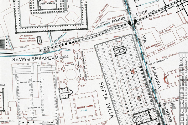 In this detail, one can see where the Aqua Virgo passed over the Via Flamina on the Arch of Claudius (Fornix Claudi). In this topography, the Saepta Julia and Serapeum are reversed.