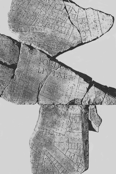 In these fragments from the marble map of Rome, one can discern an outer wall enclosing a double row of columns. On the long sides are two semi-circular exedrae and a central square niche, all fronted by another row of columns. Along the southern wall is another semi-circular apse opposite a broad flight of steps from the Clivus Suburanus. The rectangular feature in the center may been a fountain or possibly the shrine to Concordia (Aedes Concordiae) built by Livia and presented to Augustus.