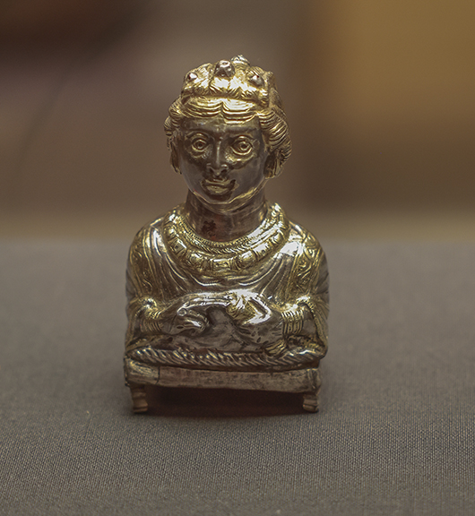 Fashioned after a noble woman of the late-Roman period, the base of this gilded silver pepper pot could be turned from closed to open and had small holes to allow the pepper to be sprinkled. Imported from India, pepper was an exotic and expensive spice that had reached the Roman world only in the first century AD. To lift the siege of Rome in AD 410, Alaric, king of the Visigoths, had demanded five thousand pounds of gold, thirty thousand pounds of silver—and three thousand pounds of pepper (Zosimus, The New History, V.41).