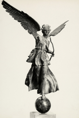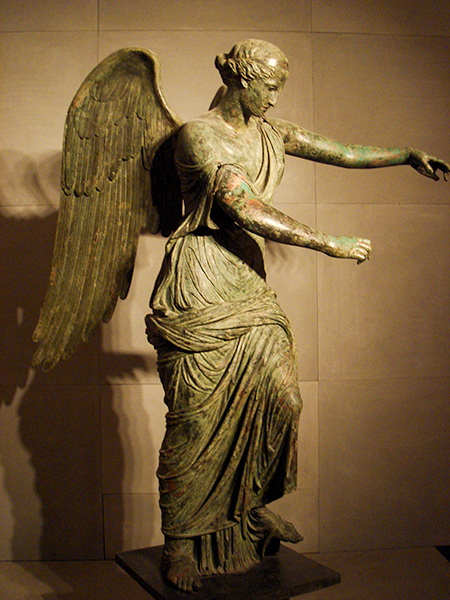 The life-size bronze statue (top) was discovered in 1826 in Brescia (Brixia), where it now is in the Santa Giulia Museo della Città. It derives from the Aphrodite of Capua in the National Archaeological Museum (Naples), which itself is a Roman copy of a fourth-century BC original. The small bronze statuette (above), which is in the National Archaeological Museum (Naples), suggests even more vividly the original appearance of Victoria.