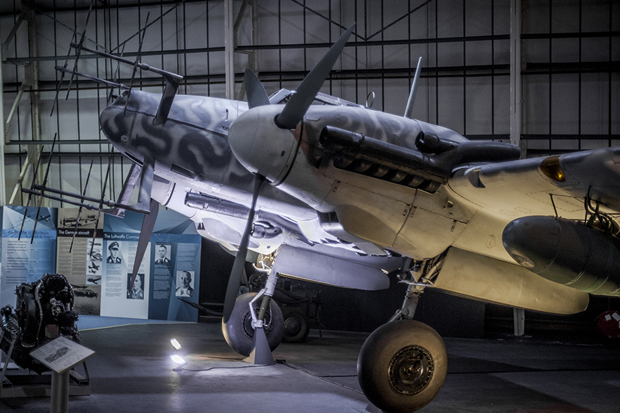 Only two Bf 110s survived the war relatively intact. One was a Bf 110F-2, which is displayed in the Deutsches Technikmuseum (German Museum of Technology), Berlin. Stationed in Finland, the plane was one of four in a Schwarm that attacked a Russian train on the Murmansk-Leningrad line in January 1943. (One can see the fitting for a ventral gun pod or two 500 kg bombs.) Hit by anti-aircraft fire, the damaged plane was forced to land on a frozen lake near the Finnish border as it attempted to return to base. Abandoned by the crew, who were rescued the next day, it later sank when the ice melted.