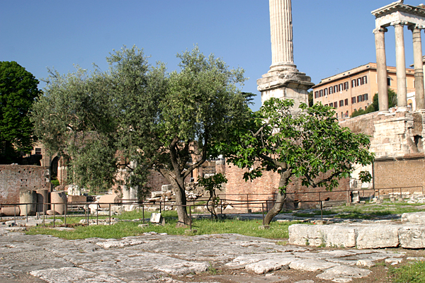 Pliny also speaks of a fig tree that grew in an unpaved section of the Forum, at the Lacus Curtius. There, too, grew a wild vine and an olive tree, which was planted to provide shade (XV.78), all of which has been recreated in the Forum.