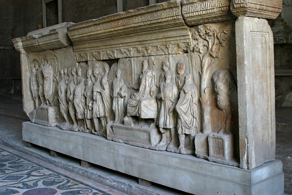 Discovered in 1872, these two marble reliefs (plutei Trajani), which now are sheltered inside the Curia, date from the time of Hadrian. The one on the right commemorates Trajan's program of food relief for children of the poor. The emperor sites in a draped chair on a low platform, his foot on a stool, and is approached by the allegorical figure of a woman with a child in her arm and leading another by the hand. On the other half of the relief, a figure stands on a rostrate platform (the beak of a ship can be seen), addressing an assembly who lift their hands in acclamation.