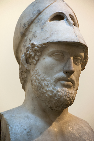 The bronze portrait statue of Pericles by Cresilas is probably the same one seen by Pausanius (I.25.1, I.28.2) on the Acropolis. The idealized head survives in several Roman herm-and-bust copies, two of which, in the Vatican (above) and British Museum (below), are inscribed with his name. Made soon after Pericles died in the Athenian plague of 429 BC, he wears the Corinthian helmet that signifies his position as strategos, commander of the army in the Peloponnesian War (431-404 BC), a war between Sparta and Athens and their allies that, after twenty-seven years of intermittent fighting, left Sparta in command of a devastated Greece.