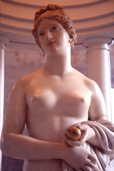 A member of the Royal Academy, John Gibson was one of the first neoclassical sculptors to color his marble statues. His Venus, which had been shown privately at his studio in Rome, created a sensation when displayed at the London International Exhibition in 1862. Delicately tinted with wax, the goddess holds the golden apple offered to her by Paris. It both entranced and scandalized Victorian society—and suggests the same polychrome realism of the Cnidian Aphrodite.