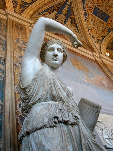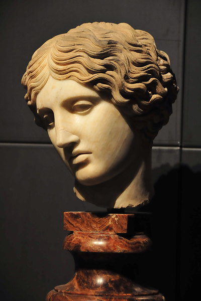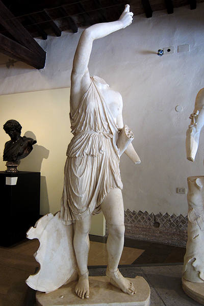 Discovered in 1770 and known as the Mattei Amazon after the family who once had owned it, the statue is in the Pio-Clementine Museum (Vatican), sequestered in the Gallery of Statues, which invariably is closed to the general public. The head is antique but modeled on the marble bust in the Capitoline Museums (top) and not original to the statue. Both arms and the right leg from the knee to the ankle also have been restored. Unlike the other two types in the Ephesian group, she appears to be unwounded. The raised arm, therefore, may be grasping a spear or lance in preparation for swinging herself onto a horse rather than simply for support.