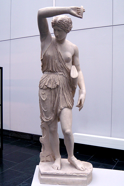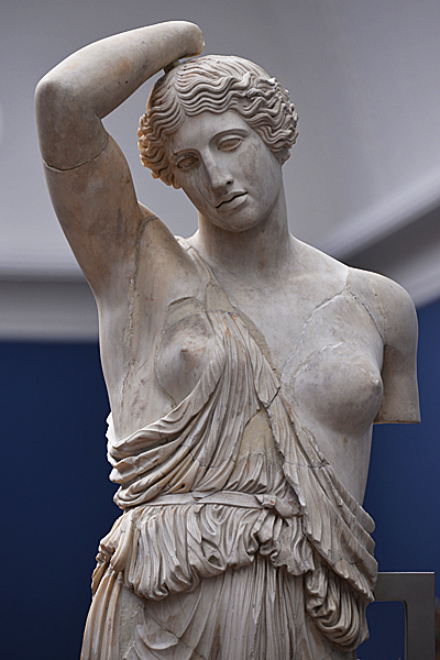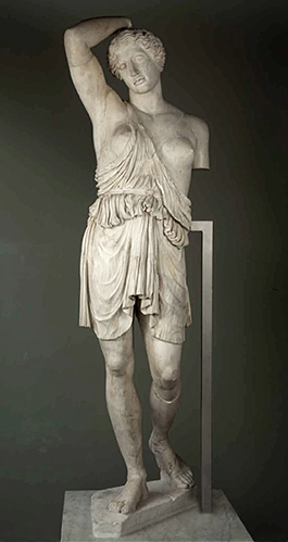 Discovered in the Gardens of Sallust in 1868 and acquired by the Pergamon Museum in Berlin the next year, this is the most complete example of the Lansdowne type—which is to say, the most restored. Almost all of the right arm and the left forearm, both hands and feet, and the pillar and its plinth have been replaced. More tired than suffering, the Amazon leans on a pillar for support, one hand draped rather listlessly, the other resting languidly on her head, the fingers slightly lifted.