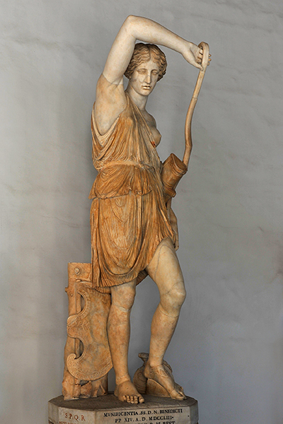 Aside from issues of attribution, there are variations in style. This Amazon in the Braccio Nuovo is identified as a Roman copy of an original by Cresilas. But, rather than exemplifying the Capitoline Amazon, the figure combines the chiton of the Lansdowne type with the support and pose of the Mattei type. Both arms, the right leg and lower left leg, quiver, and supporting trunk have been restored, the hands holding the remnants of a bow.