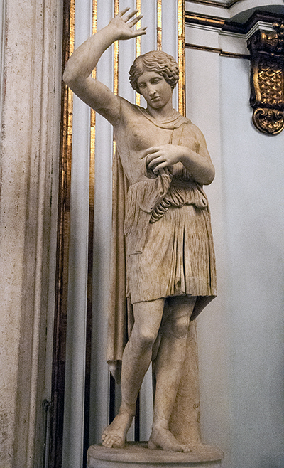 A more accessible example of the Mattei type is in the Capitoline Museums (Palazzo Nuovo). Found at the Villa d'Este (within the ancient perimeter of Hadrian's own villa) and inventoried in 1572, it was purchased and then donated to the Capitoline collection in 1753 by Benedict XIV. But the eighteenth-century restoration by Bartolomeo Cavaceppi was extensive, including the entire right arm, portions of the upper left arm and hand, right foot, and left knee and thigh. The head, too, although ancient, does not belong to the statue.