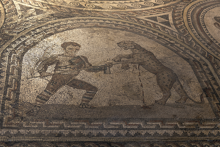Oceanus himself, hidden behind the fountain in the apse, is shown with crab claws sprouting from his forehead to signify the god's dominion over the sea and its creatures. More dramatic still is the Gladiator Mosaic.