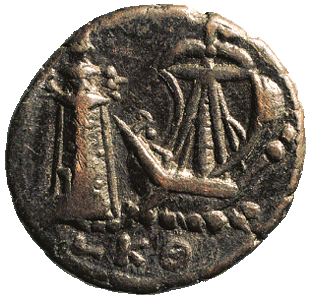 Ancient coins and engraved gems provide pictorial detail. Here, on a tetradrachm of Commodus (AD 180–192) struck at Alexandria, one can see the elevated doorway (as protection against a rising tide) and what have been described as Tritons blowing conch shells that served as antefixes on the corners of the first tier. Lowe suggests, however, that the figures might be personifications of the winds and that Zeus himself served as a weathervane, much as the figure of Triton did atop the Tower of the Winds. Many coins that show the Pharos also depict Isis velificans, a billowing sail (velum) before her.