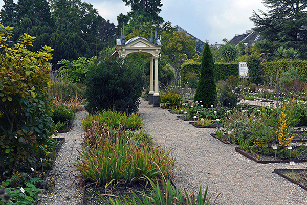 In 1594, Carolus Clusius, who had arrived at the University of Leiden the year before to serve as prefect (director) of its botanical garden, cultivated the first tulips to be grown in the Netherlands. The enclosed garden is divided into quadrants, with an ornate pavilion in the center surrounded by alternating rectangular beds in which medicinal plants herbs, flowers and other ornamentals were grown and displayed, both for learning and public display.
