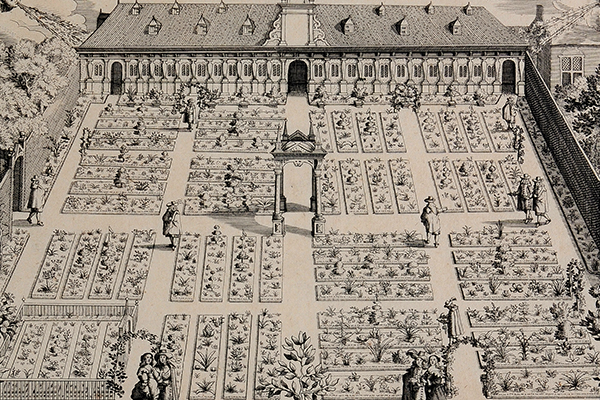 In 1610, drawings by Jan Cornelius van't Woudt (Latinized as Woudanus) were printed in a set of four large engravings, one of which (in the detail above) depicts the University's renowned botanical garden. In 2009, four-hundred years after Clusius' death, this print was a primary source for the reconstruction of his hortus botanicus. Several decades before, a venerable beech tree, which had occupied the original garden that fronted the Academy building, died—and thereby made accessible for restoration the plot of ground where Clusius first had planted his precious tulips so many centuries before.