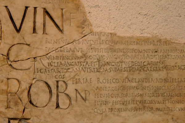 The picture, taken in October, is of grapes in the Alsace, ripening later than they would in Italy. The detail is from the Fasti Praenestini, which is in the Palazzo Massimo Alle Terme (Rome). IX Kal. Mai. (April 23) marks the date of the Vinalia. The translation of Ovid is by A. S. Kline.