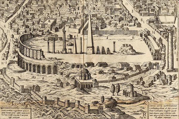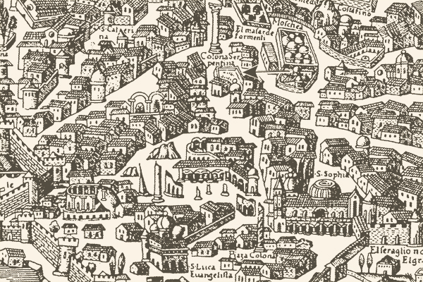 References: "The Hippodrome at Byzantium" (1948) by Rodolphe Guilland, Speculum, 23(4), 676-682; Preliminary Report upon the Excavations Carried Out in the Hippodrome of Constantinople in 1927 (1928) by S. Casson; Pero Tafur: Travels and Adventures, 1435-1439 (1926) translated by Malcolm Letts; Pierre Gilles: The Antiquities of Constantinople (1729/1988) translated by John Ball and edited by Ronald G. Musto; Pierre Gilles' Constantinople (2008) translated by Kimberly May Byrd; The Chronicle of Marcellinus (1995) translated by Brian Croke; Robert de Clari: La Conquête de Constantinople (2005) translated by Peter Noble; The Chronicle of John Malalas (1986) translated by Elizabeth Jeffreys, Michael Jeffreys, and Roger Scott; O City of Byzantium, Annals of Niketas Choniates (1984) translated by Harry J. Magoulias; "Constructing the Image of a City: The Representation of Constantinople in Christopher Buondelmonti's Liber Insularum Archipelagi" (1997) by Ian R. Manners, Annals of the Association of American Geographers, 87(1), 72-102; "Customs and Fashions of the Turks" (2014) by Nadine M. Orenstein, in Grand Design: Pieter Coecke van Aelst and Renaissance Tapestry edited by Elizabeth Cleland (museum catalog); The History of Conquest of Peru (1847) by William H. Prescott.