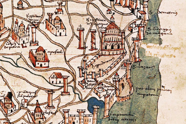 Drawn on vellum, this detail is a panoramic view of Constantinople from the Liber Insularum Archipelagi ("Book of the Islands of the Archipelago"), an illustrated guide to navigating the islands by Cristoforo Buondelmonti, an aristocratic humanist and Florentine cleric who enjoyed the patronage of Cosimo de' Medici. Using Rhodes as a base, he traveled throughout the Aegean islands, voyaging to Crete, Mount Athos, and the Hellespont. The original manuscript (before 1420) of his compiled notes and illustrations has been lost, but a version of 1422, written after concluding a visit to Constantinople that year, survives in a large number of later manuscripts—although with considerable differences as they variously were interpolated and emended. The earliest representation of the city, the illustration also is the only one that predates its conquest by the Ottoman Turks in 1453. Here, the Hippodrome, seemingly fortified with turrets, fronts the basilica of Santa Sophia (Hagia Sophia), which was converted to a mosque on the very day that the conquering Mehmed II entered the city.