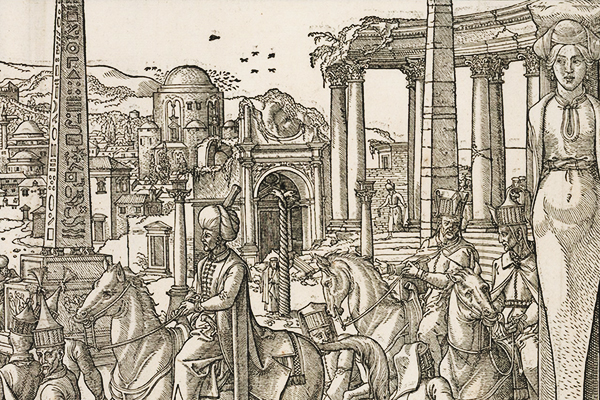 As Süleyman and his cortege pass by the ancient Hippodrome, the monuments in the background are shown as they appeared eighty years after the conquest of Constantinople. Although they have been rearranged and compressed to fit the scene, many can be recognized. Hagia Sophia is to the left of the Egyptian obelisk erected by Theodosius in AD 390. (From this perspective, the basilica would not have been visible but almost directly ahead of the procession.) To the right of Süleyman is the entwined Serpent Column from Delphi, flanked by the ruined pedestals of former monuments. The other obelisk is that of Constantine VII (d. AD 959), who restored the original pillar. Unlike the monolithic granite obelisk of Thutmosis III, it is constructed of individual limestone blocks that once were clad with gilded bronze plaques. They, as well as all the other ancient bronze statues that adorned the Hippodrome (except for the Serpent Column) were looted by the Crusaders in 1204. The domed building above the sultan's head may be that of Santa Luca Evangelista, as seen in the other two illustrations.