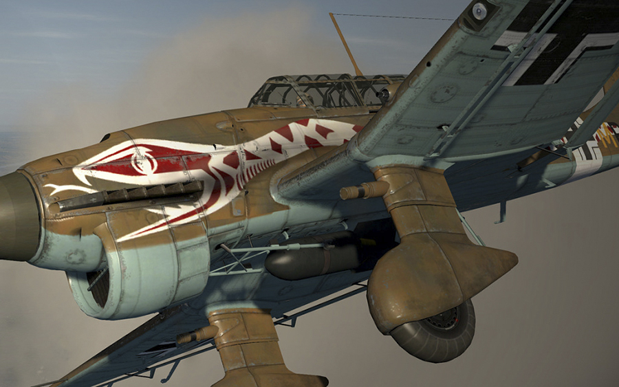 This screenshot is based on illustrations in Weal, and Leonard and Jouineau, who identify the plane as an extended range R-2 of 6./St.G 2, with the identification T6+CP—a supposition that would persist until the publication of Urbanke's article in 2005. The upper surface is RLM 70/71 and the lower, RLM 78. But at the time, this too was conjecture—especially the angled jaw of the snake, which was not visible in the single photograph then available.