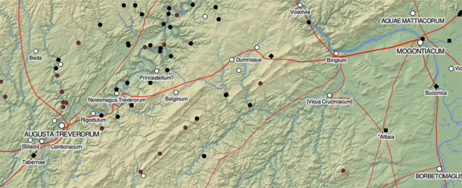 This detail is from the online Digital Atlas of the Roman Empire by Johan Åhlfeldt and hosted by the University of Gothenburg, Sweden. It show the topography of the region and the route taken in AD 368 by Ausonius along the Roman road from Bingium (Bingen) on the Rhine to Augusta Treverorum (Trier) on the Moselle, a distance of some seventy-five miles. (Trier takes its name from the Treveri, a local Celtic tribe—and so Treverorum, "of or among the Treveri.")