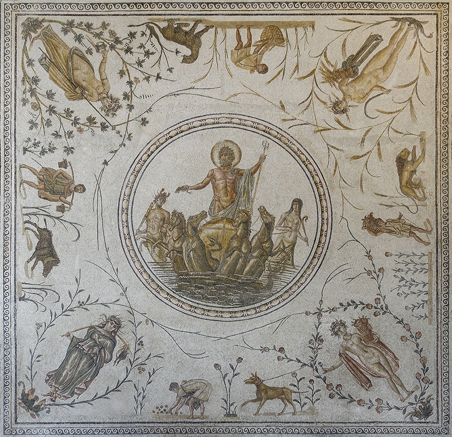 If the portrait of Virgil is the most unique of mosaics, the most impressive is a depiction of Neptune and the Four Seasons (Horae), which dates to the second-century AD and measures sixteen feet square. Neptune's chariot is pulled by four hippocampi, mythological creatures with the foreparts of a horse and the finned tail of a fish. The god himself holds a trident and a dolphin, symbolizing his dominion over the sea, and is escorted on either side by a Triton and a Nereid. But not merely a god of the ocean, Neptune, his head hallowed with a nimbus to symbolize his divinity, is portrayed as a cosmocrator or ruler of the cosmos itself.
