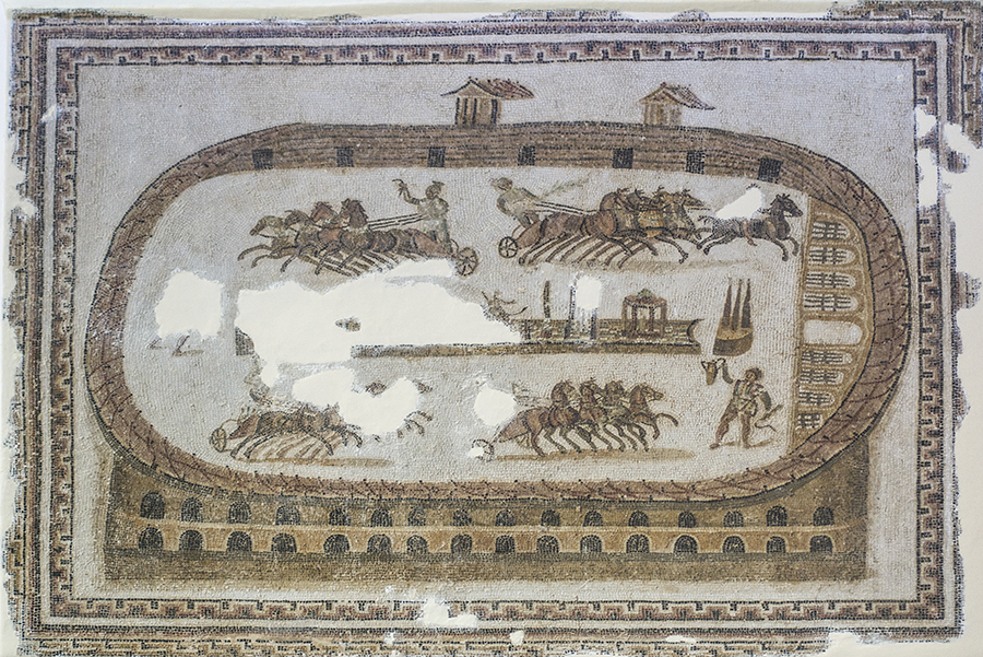 To Salvian, a Christian trained in the law, the capture of Carthage by the Vandals in AD 439 was certain justification for his jeremiad: "The barbarians' arms clashed about the walls of Cirta and Carthage while the Christian congregation of the city raved in the circuses and wantoned in the theaters" (VI.12). This early third-century AD mosaic may depict the circus at Carthage, which was second only to the Circus Maximus in size (but not in capacity). The four racing factions are represented, and one sees the carceres or starting gates and the central spina about which the chariots raced. Wine awaits the victor.