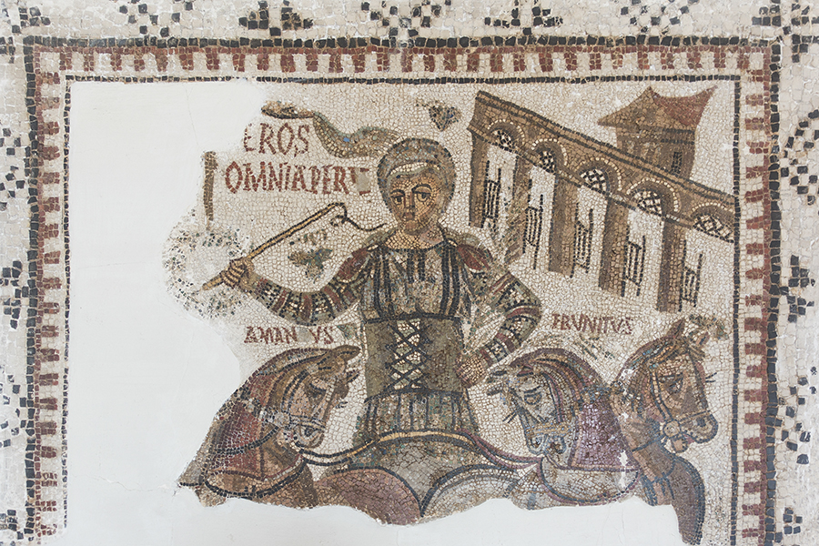 If the Carthaginians could linger at the games while the Vandals were at the gates of the city, this late fourth-century mosaic explains their enthusiasm. It depicts Eros, the auriga or charioteer for the green faction, by whom omnia per te ("all things by you"). Two of the four horses that pull his quadriga are immortalized as well: Amandus ("Lovable") and Frunitus ("Enjoyable").