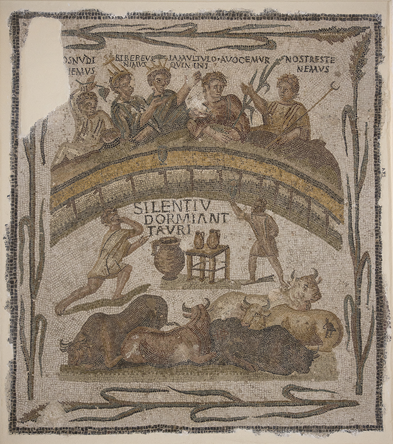 Although this mosaic is not illustrated in the museum catalog, it deserves comment. The Telegenii were a sodality or professional guild of theatrical producers who provided wild animals to the games in North Africa (and sometimes the actual venatores or animal fighters themselves). Here, they are celebrating. One member, who seems to be presiding over the event, carries a staff with a crescent moon and declares Nos tres tenemus (literally, "We have three" but signifying that "We three are getting along fine"). The others variously exclaim Avocemur ("We might be amused"), Ia[m] multu[m] loquimini ("You have spoken too much already"), Bibere venimus ("We have come to drink"), and, in a damaged caption, [N]os nudi [f]iemus ("We will be naked")—a proposal the reveler seems already to have adopted.