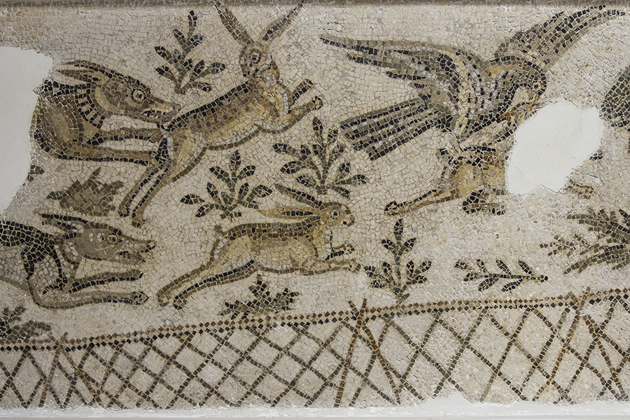 This extraordinary scene is from a fourth-century AD mosaic known as the "Boar Hunt," although rabbits seem to be the quarry, one of which is cowering in the grass. The sleek hounds that pursue them likely are Vertragi, which track game by sight rather than scent (coursing). They were so swift that the hunter could follow the chase on horseback, rather than having to run behind on foot. Horses, hares, and hounds: it was the sport of the chase that was so enjoyable.
