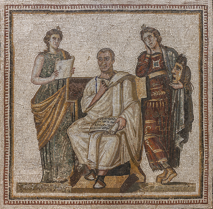 It is the mosaics for which the museum is renown—the most important of which is the only one of Virgil and the earliest portrait of the Roman poet. He is depicted holding an open scroll of the Aeneid. One can read Musa, mihi causas memora, quo numine laeso (“O muse, relate to me the causes by what deity having been offended…”) from Book I, verse 8. Flanking the poet on either side are Clio, the muse of history, holding a scroll, and Melpomene, the muse of tragedy, holding a theatrical mask. (The museum itself identifies the muses as Calliope and Polymnia.) Given that Aeneas, a Trojan hero destined to found Rome itself, falls in love with Dido, the queen of Carthage, it is not surprising that Virgil would be so honored.