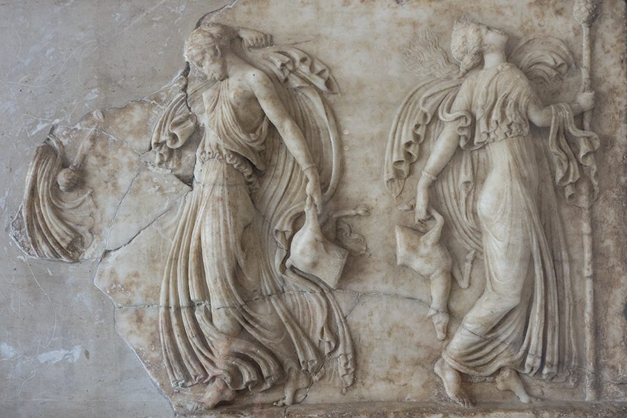 This marble bas-relief of Maenads (from the Greek verb "to rave") dates from the first-century AD. One carries a knife and the dismembered haunch of an animal that has been sacrificed in a ritualistic act of sparagmos—in remembrance that Dionysus himself had been torn apart and consumed by the Titans. Another holds a thyrsos, a staff crowned by a pine cone and another attribute of Dionysus, here signifying fertility and propagation.