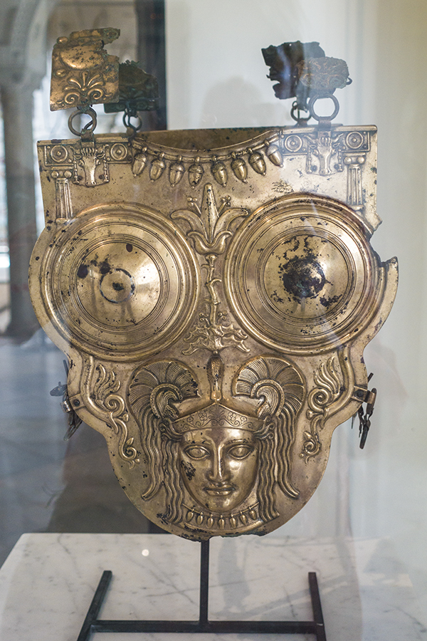 In spite of the distracting reflections, this bronze cardiophylax, so named because it was designed to protect the heart from injury, still manages to impress. Dating from the third or second-century BC, the cuirass is Italian in origin and likely was acquired in Roman Campania when Hannibal occupied southern Italy between 211–203 BC. The helmeted figure of Athena is another apotropaic image to protect the wearer.