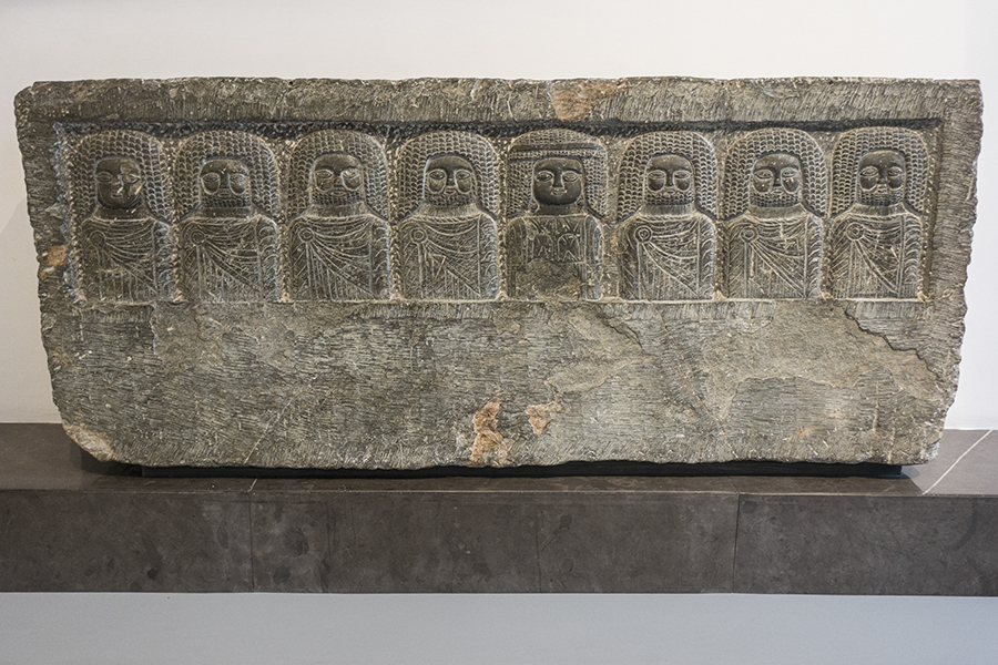 This stele dates from sometime soon after 200 BC but before 46 BC—its terminus ad quem when Carthage was refounded by Julius Caesar as a Roman colony (a century after the city had been completely destroyed in the Third Punic War). It depicts eight deities flanking a goddess (the darker figure in the middle). All are distinguished by their intricately braided hair, the gods wearing a chlamys fastened at the right shoulder by a brooch.