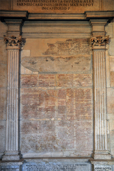 Behind the She-Wolf are the Capitoline Fasti, which were placed inside its architectonic frame in 1586. The marble fragments were discovered in the sixteenth century and originally had decorated the inside wall of the Arch of Augustus, which was erected in 20 BC to honor his triumph over the Parthians. The Fasti records the consuls, tribunes, censors, and magistrates from the beginning of the Republic to the time of Augustus.