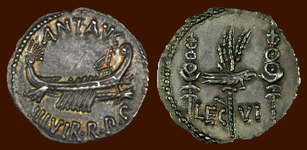 Obv. ANT AVG III VIR R P C. Galley to the right with banners at the prow; Rev. LEG VI. Eagle (aquila) facing right between two legionary standards (signa). Reference: BMC 197, RSC 33, Sear 356.