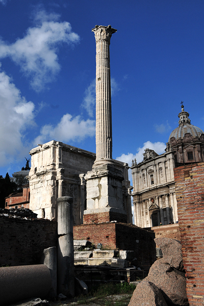 The last monument to be built in the Roman Forum, the inscription on the pedestal of the column indicates that the gilded statue on top was dedicated in AD 608 by Smaragdus, the exarch (governor) of Italy, to the Byzantine emperor Phocas, who earlier had been persuaded by Pope Boniface IV to give the Pantheon to the church (Bede, Ecclesiastical History, I.4). The fluted marble column and Corinthian capital were appropriated from other monuments, the high plinth on which they stand originally used to support the honorary column to Diocletian.