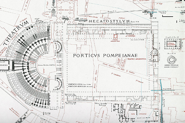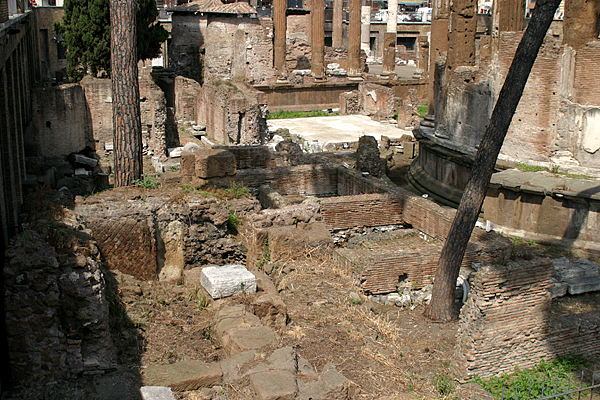 The eastern end of the portico abuts four Republican temples, two of which can be seen above in a detail from the topographical atlas of Rodolfo Lanciani (1901) and incised on a fragment of the Forma Urbis Romae. One is thought to be the Temple of Juturna and, next to it, a round temple, which is shown above. This is as close as the public can hope to be to the site of Caesar's assassination.