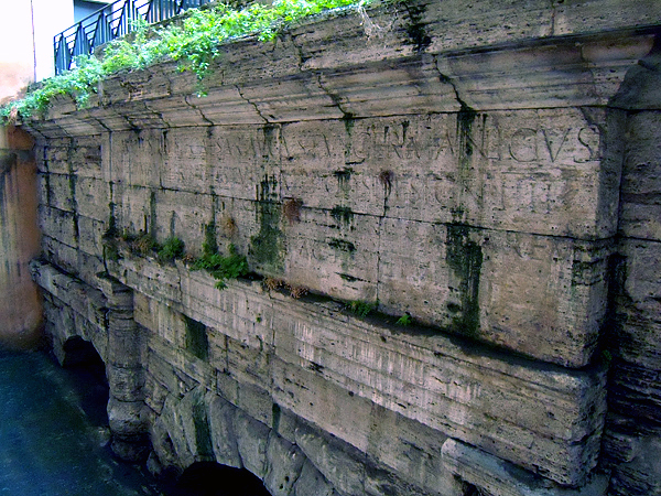 Three half-obscured arches of the Aqua Virgo, their piers still buried in the accumulated silt of twenty centuries, support the specus of the aqueduct (the covered channel through which the water flowed). Now nearly level with the present-day Via del Nazareno, one of the arches originally spanned an ancient road, its engaged columns framing the projected attic. An inscription on both sides (so as to be read by those traveling in each direction) declares that Claudius rebuilt this stretch of the arcade (circa AD 45) after it had been robbed of stone by Caligula for another project, possibly "an amphitheatre beside the Saepta" (Suetonius, Life of Caligula, XX1; Dio, Roman History, LIX.10.5). But this section of the Aqua Virgo is not near the Saepta Julia, and it may be that the damage simply was preliminary construction work that later was completed by Claudius.