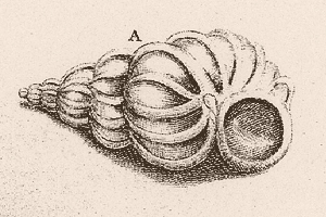This is the first illustration of the Precious Wentletrap, which appeared in the Appendix to Rumphius' D'Amboinsche Rariteitkamer (Plate XLIX). There, its editor described the shell as having "only a nice white color, but its composition is wondrous, and cannot be imagined as such, the way it is in fact." Notice in the etching that the orientation of the shell, like so many prior to the eighteenth century, has been reversed, the dextral shell appearing sinistral.