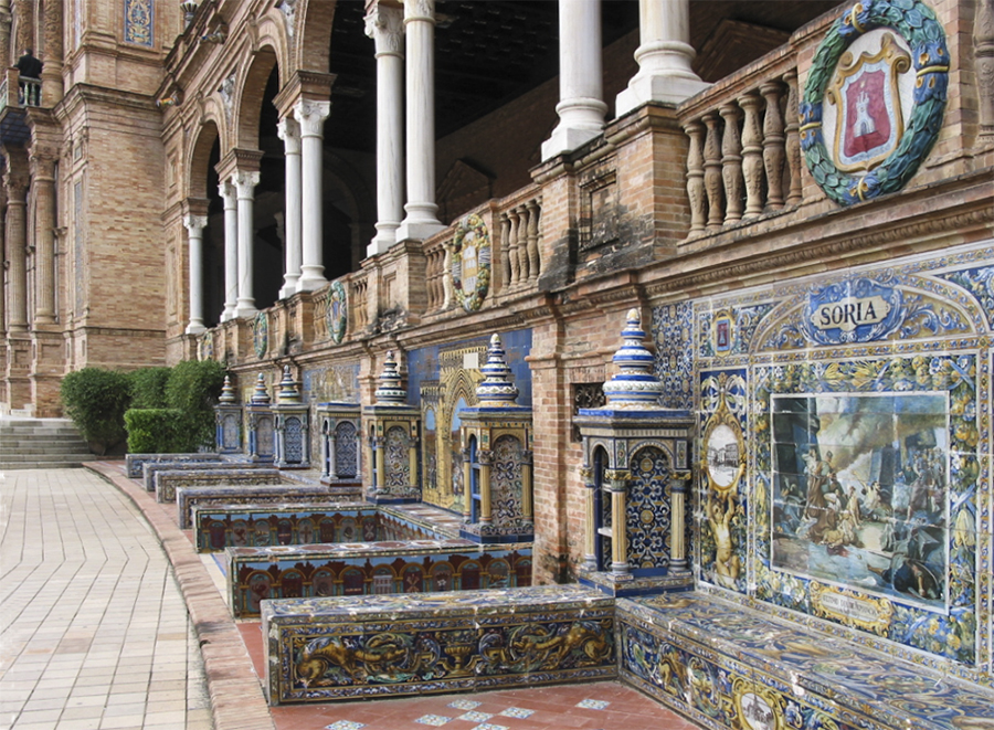 The photograph is of the Plaza de España in Seville. Each of Spain's 48 provinces that existed at the time of construction in 1929 are represented in a series of alcoves decorated with vivid ceramic tiles. Soria is shown because it was there that the Siege of Numantia took place in 133 BC.