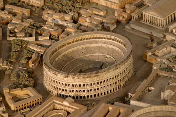 In this detail from the Model of Rome, the Temple of Venus and Rome is in the background and in the foreground, two training schools built by Domitian: the Ludus Magnus for gladiators and the Ludus Matutinus for animal fighters.