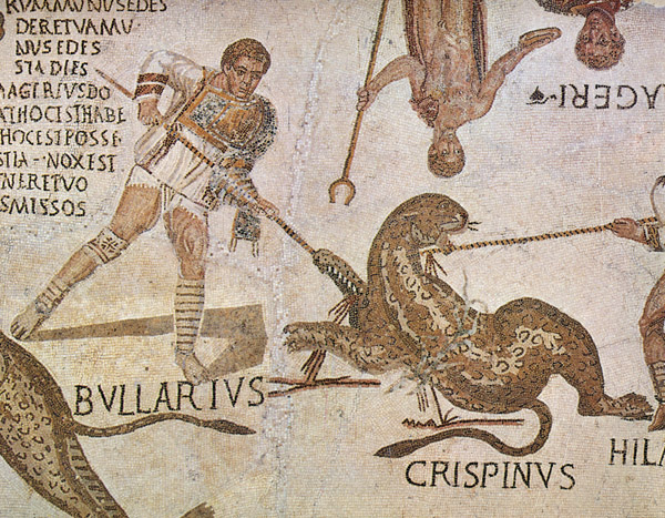 Named after the aristocratic owner of the country villa where it was found, the Magerius mosaic presumably was intended for a public space of his house, such as the dining room, where the couches would be placed around the periphery of the room, recreating for the guests the original spectacle in miniature. This detail showing Crispinus ("Curly") being killed—or the dying leopards in the Borghese mosaic—depicts an event that is disturbing to modern sensibilities. That it was meaningful and attractive to the ancient Romans is one measure of the difficulty in presuming to understand different cultural norms. In the mosaic, the audience is not represented; rather, it is replaced by the viewer, who gazes upon the scene. Scenes such as this invariably show wounded animals, their blood spilling on the sand, at the moment they are dispatched. They indicate the interest of the spectator in exotic animals, their variety and number, and ultimately their death in an uncertain contest against a human opponent. The interest of Magerius, himself, as editor of the games is to remind the guests of his beneficence and the implicit honor due him. Presumably over dinner, he would be able to remark on the game, just as Trimalchio, in the Satyricon of Petronius (XXIX), had pictures of himself on the wall of the peristyle, including one of gladiators. In such mosaics, the ferocity of beasts (and the implicit threat of all nature) is subjugated and safely reduced to a dining room decoration.