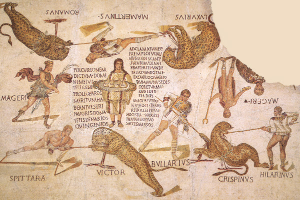This detail showing Crispinus ("Curly") being killed depicts an event that is disturbing to modern sensibilities. That it was meaningful and attractive to the ancient Romans is one measure of the difficulty in presuming to understand different cultural norms. In the mosaic, the audience is not represented; rather, it is replaced by the viewer, who gazes upon a scene of wounded animals, their blood spilling on the sand, at the moment they are dispatched. Such mosaics indicate the interest of the spectator in exotic animals, their variety and number, and ultimately their death in an uncertain contest against a human opponent. The interest of Magerius, himself, as editor of the games is to remind the guests of his beneficence and the implicit honor due him. Presumably over dinner, he would be able to remark on the game, just as Trimalchio, in the Satyricon of Petronius (XXIX), had pictures of himself on the wall of the peristyle, including one of gladiators. In such mosaics, the ferocity of beasts (and the implicit threat of all nature) is subjugated and safely reduced to a dining room decoration.