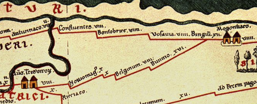 This schematic is from the Tabula Peutingeriana, a early thirteenth-century copy of a fourth-century AD itinerarium of Rome's cursus publicus or public way. The route is in stages from Bingium to Dumno (Dumnissus), Belginum, Noviomagnus Treverorum, and Augusta Treverorum, the distance of each marked in Roman miles (curiously, the numbers add up to forty statute miles). Vegetius, writing in the late fourth-century AD, would have approved.