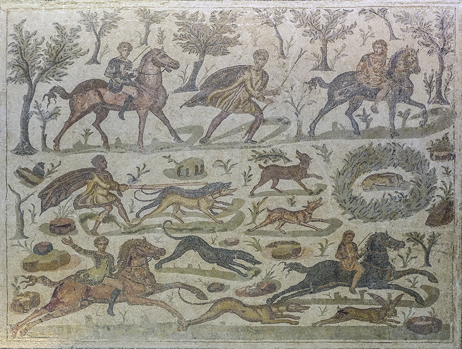 This extraordinary scene is from a fourth-century AD mosaic known as the "Boar Hunt," although rabbits seem to be the quarry, one of which is cowering in the grass. The sleek hounds that pursue them likely are Vertragi, which track game by sight rather than scent (coursing). They were so swift that the hunter could follow the chase on horseback, rather than having to run behind on foot. Horses, hares, and hounds: it was the sport of the chase that was so enjoyable.