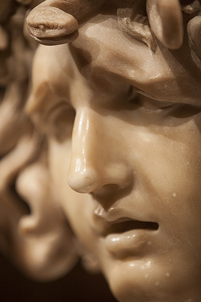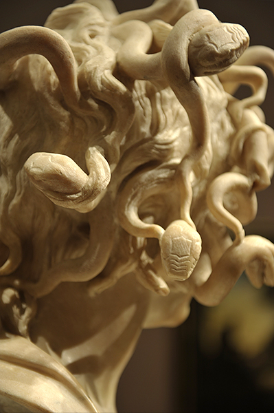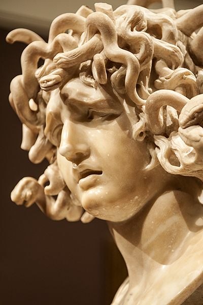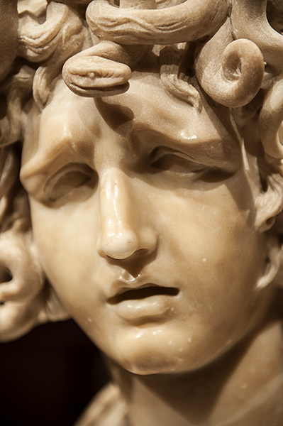 A Baroque masterpiece, the bust of Medusa by Gian Lorenzo Bernini probably was sculpted in the decade 1638–1648. Since 1734. it has been in the Palazzo dei Conservatori (Rome), displayed in the Sala delle Oche (Hall of the Geese), so-named from the two bronze ducks that reside there. Situated against a wall, its placement does not allow many other perspectives. The pictures below were taken when the Medusa was on exclusive loan to the Legion of Honor (San Francisco) in 2011.