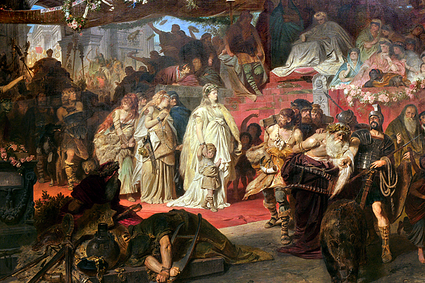 In this view of Polity's painting, which was taken at the opposite end of the gallery in the Neue Pinakothek (Munich), one still can barely capture the huge canvas. Segestes cannot bring himself to look upon his daughter, while Tiberius, flanked by his henchman Sejanus, seemingly is indifferent to the spectacle. It is only the aristocratic women of Rome who are fascinated at the exotic creatures paraded before them. The proud and defiant Thusnelda, accompanied by a nurse and attendants, is presented in marked contrast to the somnolent figure of the emperor. Leading the procession is the priest mentioned by Strabo (Geography, VII.1.4), dragged along by his white beard. Behind Thusnelda are chieftains of the Cherusci, including her brother, Segimuntus, who once had been a priest of Augustus in Cologne (Tacitus, Annals, I.57). Finally, silhouetted in the background is Germanicus himself, here a minor participant in his own triumph.