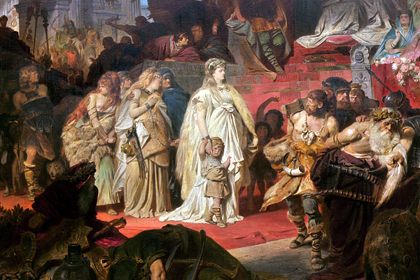 The detail above is from Thusnelda Led in Germanicus' Triumph (1873/1874), a monumental painting by Carl Theodor von Piloty measuring approximately 16 by 23 feet and occupying an entire gallery wall of the Neue Pinakothek (Munich). It is Thusnelda, of course, a heroine of nineteenth-century German nationalism, who commands the scene, her young son clutching her gown.