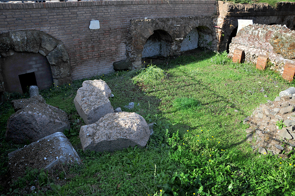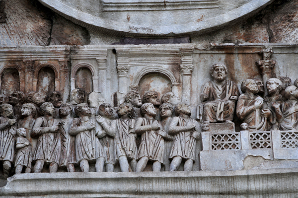 In this detail of the north face of the Arch of Constantine, the single fornix arch is depicted in the panel frieze below the eastern roundel.