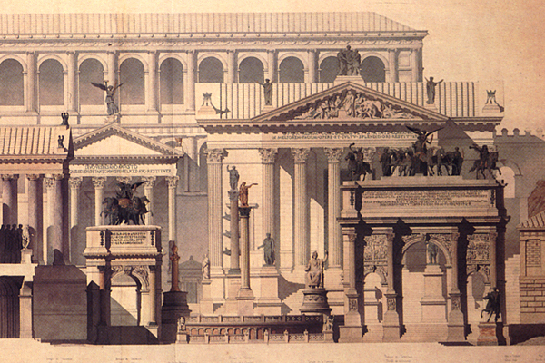 This état restauré by Alfred-Nicolas Normand (1852) depicts how the Arch of Tiberius might have been placed in the Roman Forum.