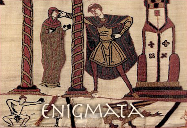 What more appropriate image to illustrate the sexual nature of some Anglo-Saxon riddles than this enigmatic scene from the Bayeux Tapestry. The inscription reads "Where a certain cleric and Ælfgyva." Though the event must have been obvious to a contemporary audience, it now is a complete mystery. Whatever happened, the explicitly naked figure in the border suggests a scandal, perhaps Harold's breach of promise to marry one of William's daughters, a betrothal that occurred while he was a guest of the duke. One can only imagine what thoughts occupied the mind of the nun who so assiduously stitched it.
